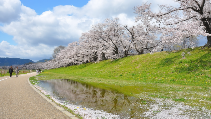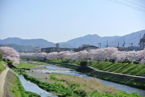 京阪石清水八幡宮站以北,跨過御幸橋之處,在木津川和宇治川合流的背割堤上,種有約1.4公里的櫻花樹。每到4月上旬,這裡會形成一條櫻花大道。在河川公園的周邊還有草地廣場和展望台。