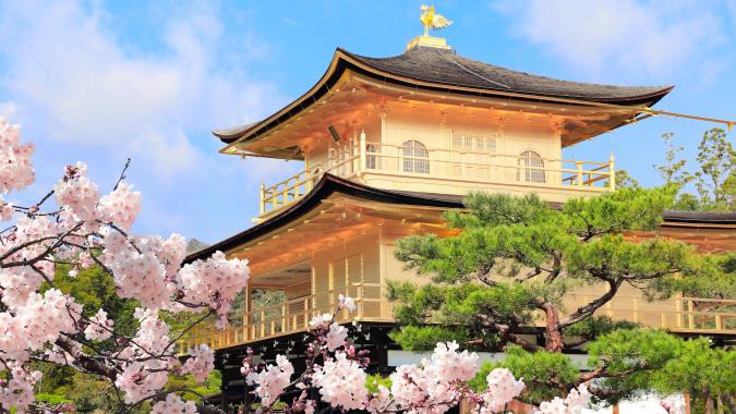 原為日本足利義滿將軍於公元1397年建造的山莊,名為北山殿,後改為佛寺,名鹿苑寺。又因外表貼金,而又稱金閣寺。頂端並有隻象徵吉祥的金鳳凰裝飾,是京都永恆的精神象徵。